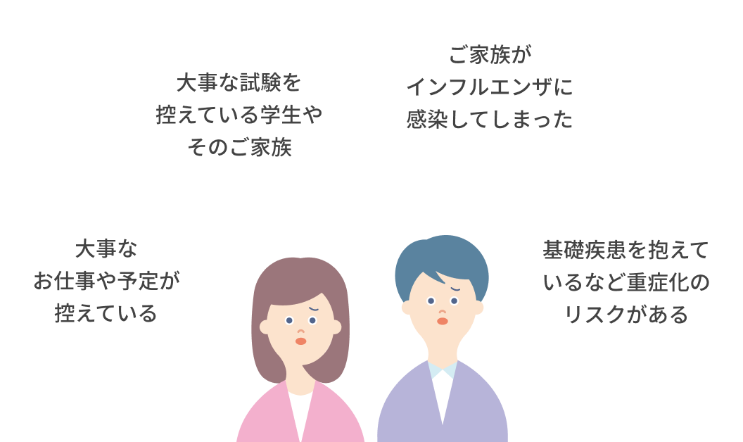 感染者と接触した後、48時間以内に服用することで、体内でインフルエンザウイルスの増殖を抑え込みインフルエンザを発症する確率を低減させる効果が期待できます。