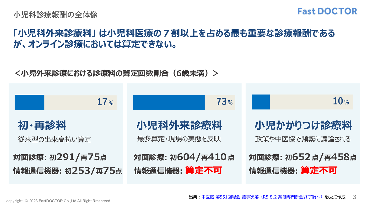 本稿で示したように、小児の診療では問診や説明、経過観察など多くの医療資源が必要であり、オンライン診療においても例外ではありません。小児科外来診療料の包括的な評価がオンライン診療にも適用されることで、オンライン診療が医療体制の一部としての機能を強め、対面診療を補完しながら小児医療全体の持続可能性を高めることにつながると当社は考えています。