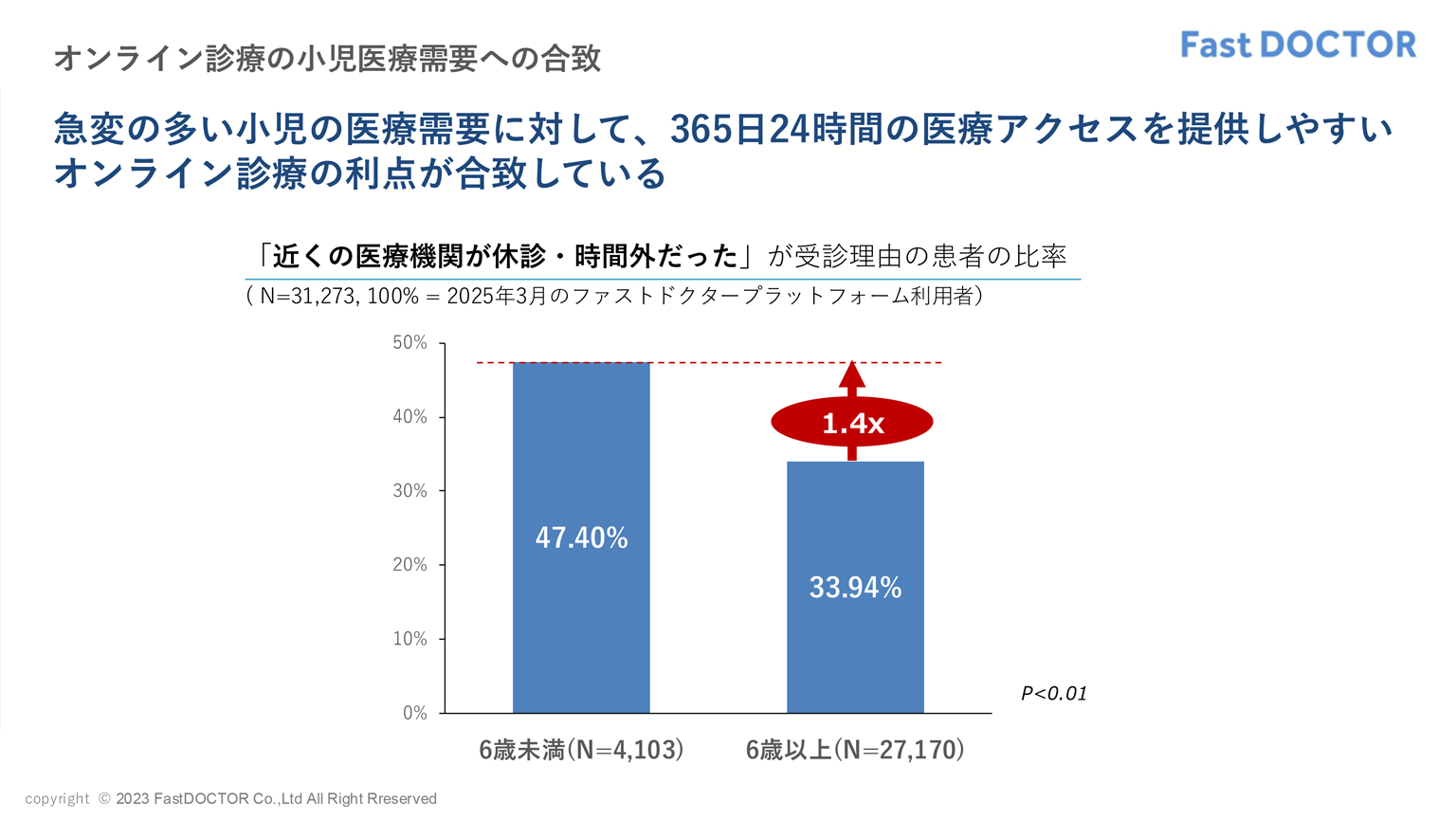 当社提携医療機関のオンライン診療における小児の受診理由を見ると、「近くの医療機関が休診・時間だった」ためと回答した割合は、6歳未満の方が、6歳以上と比べて1.4倍高い結果でした。小児は急な発熱、嘔吐、発疹などが起こりやすく、保護者には夜間休日を問わず「今すぐ受診すべきか」「翌朝まで様子をみてよいか」を判断する負担が生じます。共働き世帯の増加による親の負担や、夜間に子どもを連れて受診しづらい地理的な制約を考慮すると、「まずオンラインで医師に相談し、必要に応じて対面受診に向かう」という行動は、現代の多様なライフスタイルに適した受診行動と考えられます。