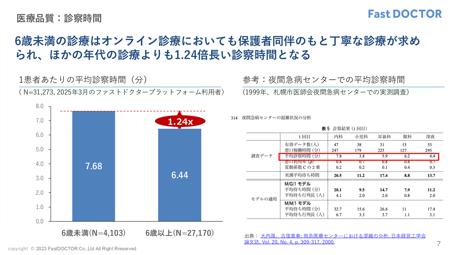 次に診療時間に着目すると、6歳未満のオンライン診療の所要時間は[平均7.68分]であり、6歳以上と比べて1.24倍を要しています。小児領域の対面診療に関する代表的な診療時間データは限られていますが、参考として、1999年に報告された夜間救急での小児科の診療時間は[平均3.8分]でした(※4)。比較すると、小児診療に求められる問診や保護者との対話といったプロセスに、一定の時間が確保されていると捉えることができます。