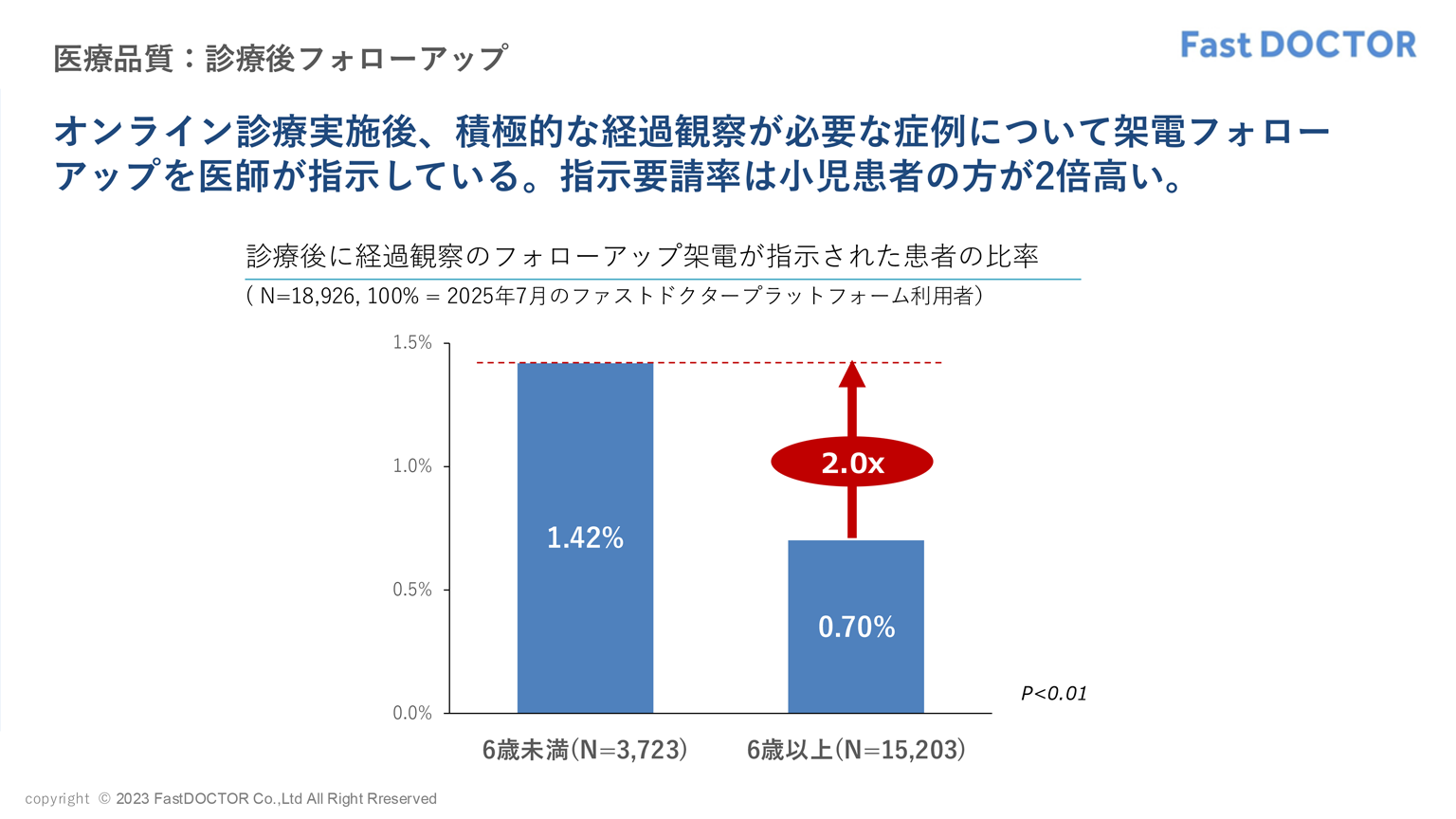 診療後、医師が “積極的な経過観察が必要” と指示した場合には、看護師が架電によるフォローアップを行って症状の推移を確認しています。全体としてフォロー指示は約1%前後と限定的ですが、6歳未満では、6歳以上の約2倍の割合で指示が出されており、乳幼児は診療後の状態変化に注意が必要なケースが相対的に多いことがわかります。こうしたフォローアップによって、オンライン診療においても診療後の状態変化を継続的に確認する体制を構築しています。