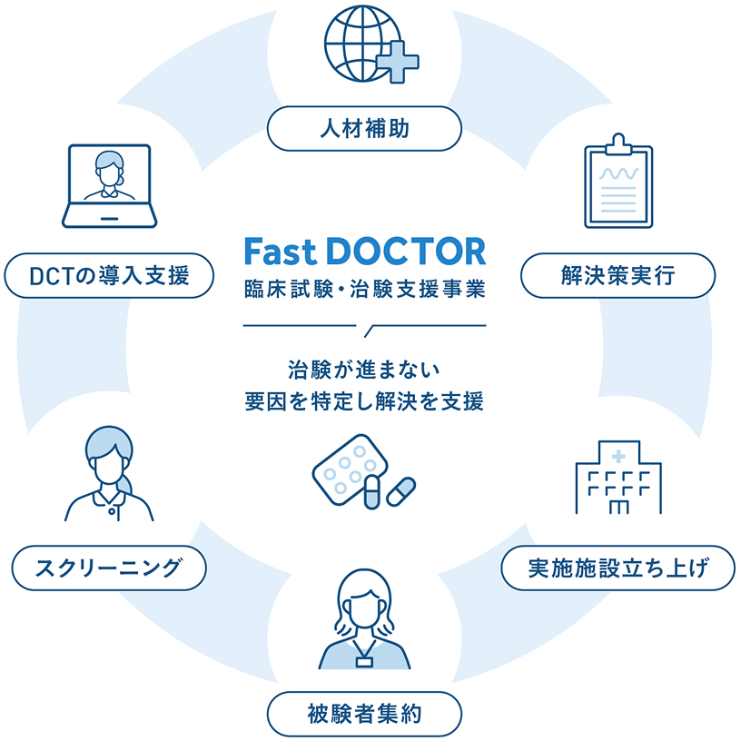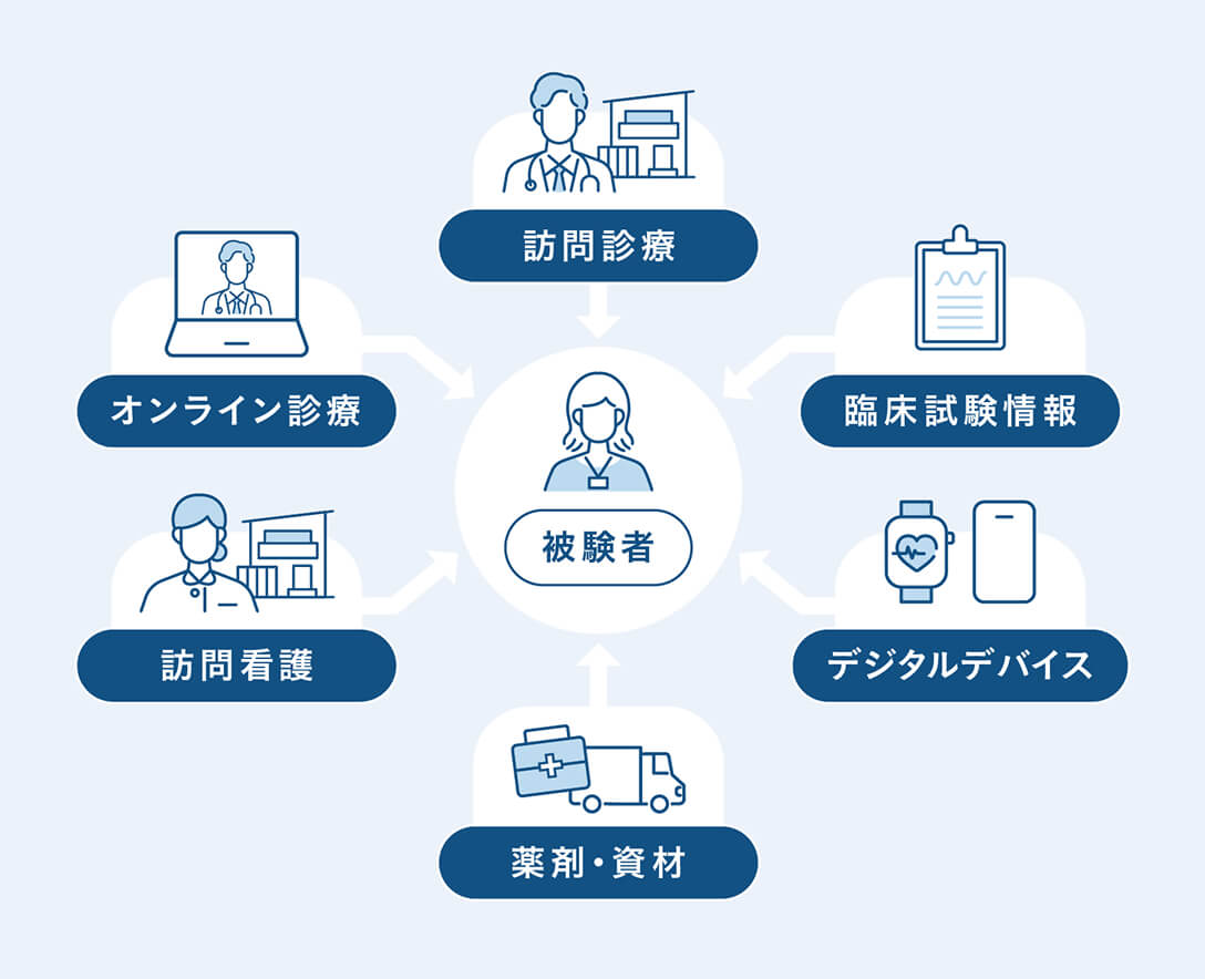 新たな治験のかたちとして、ファストドクターが既存事業のナレッジを活かし、在宅診療やオンライン診療を活用した(DCT:分散型治験)の導入を支援いたします。来院負荷が高い疾患をお持ちの方、小児やご高齢の方の治験参加ハードルの低減に貢献します。