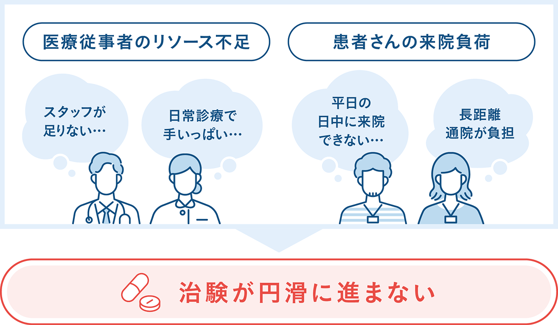また、治験に参加する患者さんに目を向けると、ライフスタイルの多様化が進んだ結果、治験に参加するため、平日の日中に医療機関に来院することが、患者さんにとって大きな負荷となっています。