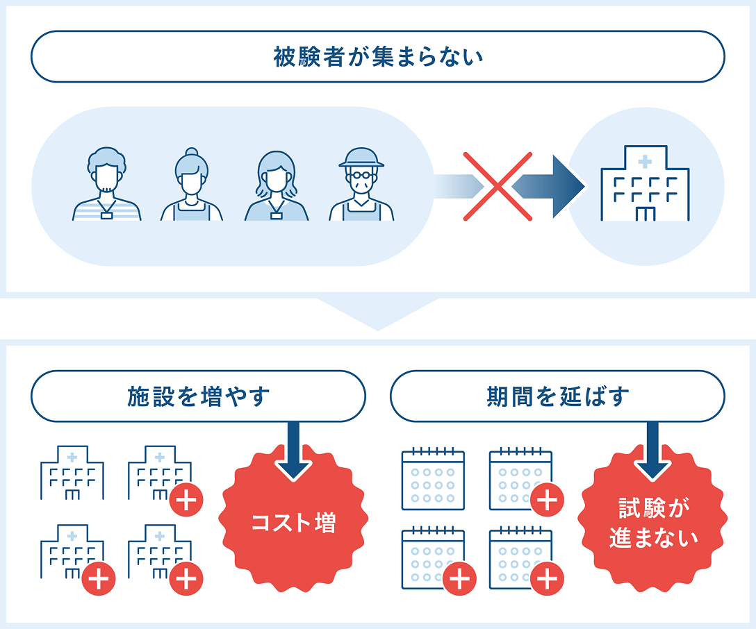 日本は世界的に見ても医療機関数が多く、1施設あたりの被験者数が少なくなりがちです。被験者がなかなか集まらず、試験が進みにくくなります。試験を進めるために、多くの実施施設を立ち上げると、コストが跳ね上がってしまいます。