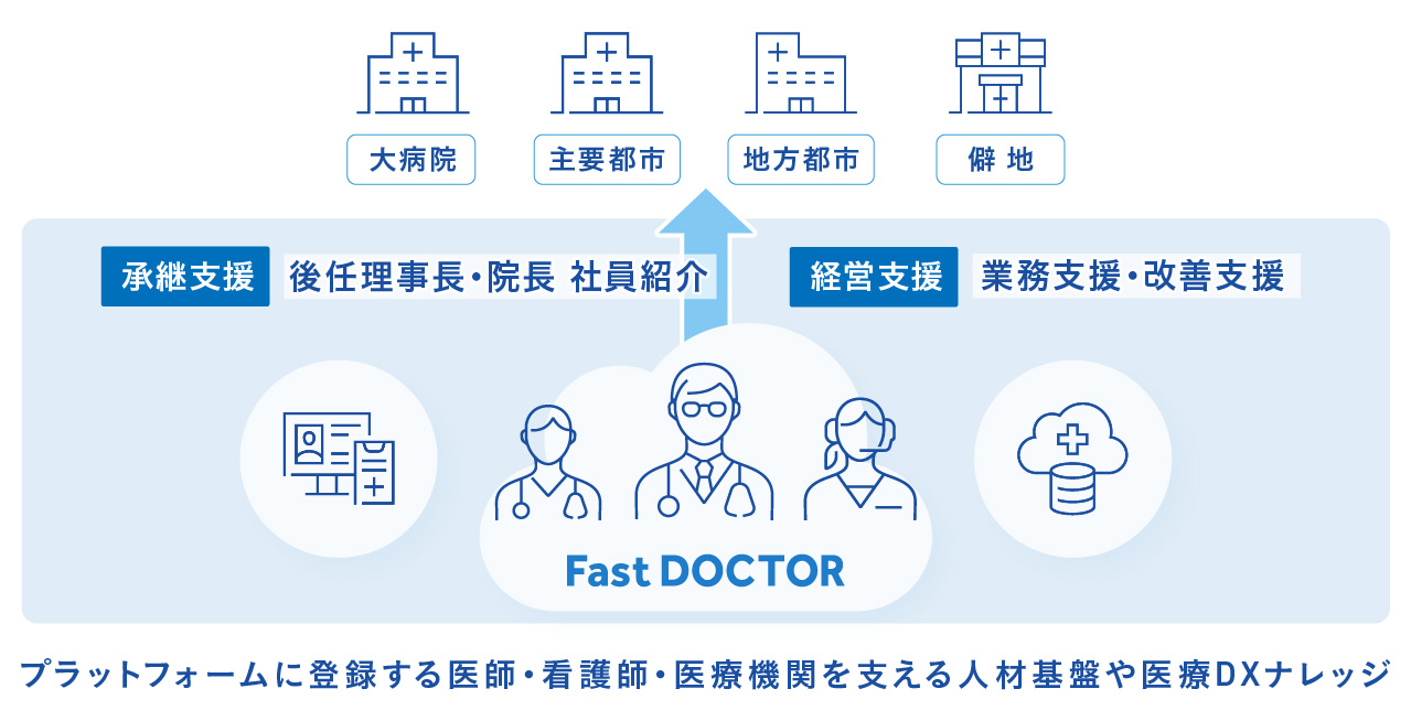 ファストドクターが培ってきた医師ネットワークや医療運営の知見を活かし、後継者不在に悩む診療所の事業承継と、その後の経営・運営を一体で支援します。承継の成立だけを目的とするのではなく、承継後も地域で医療を提供し続けられる体制づくりを見据えた支援を行います。