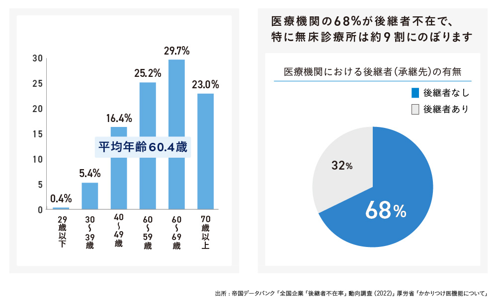 「かかりつけ医機能」は、医療・介護の需要が高まる2040年に向けて、質の高い医療提供体制を全国で確保するための重要な役割として位置づけられています。その一方で、かかりつけ医機能を担う開業医の平均年齢は60.4歳と高齢化が進み、次の世代へと引き継ぐ転換期を迎えつつあります。 しかし「後継者が不在」とする診療所は9割を超えており、地域の医療提供体制が失われていくことが懸念されています。