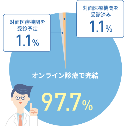 受診後の患者の97.7%がオンライン診療のみで完結と回答しています。
